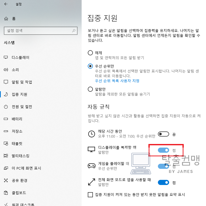 02 시작메뉴 설정->시스템->집중지원 순서로 클릭합니다. 자동규칙의 디스플레이를 복제할때 를 켬으로 설정하면 곤란한 상황을 피할 수 있습니다.