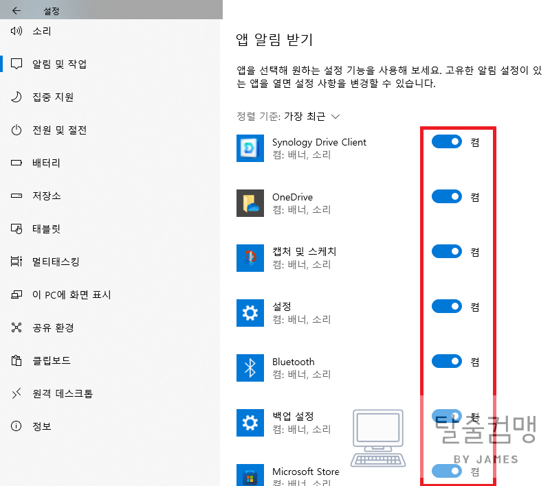 01-1 모든 알람은 괜찮은데 하나의 알림이 자주 떠서 귀찮다 혹은 신경이 거슬린다 싶으면 각 프로그램별로 알림을 on/off할 수 있습니다.
