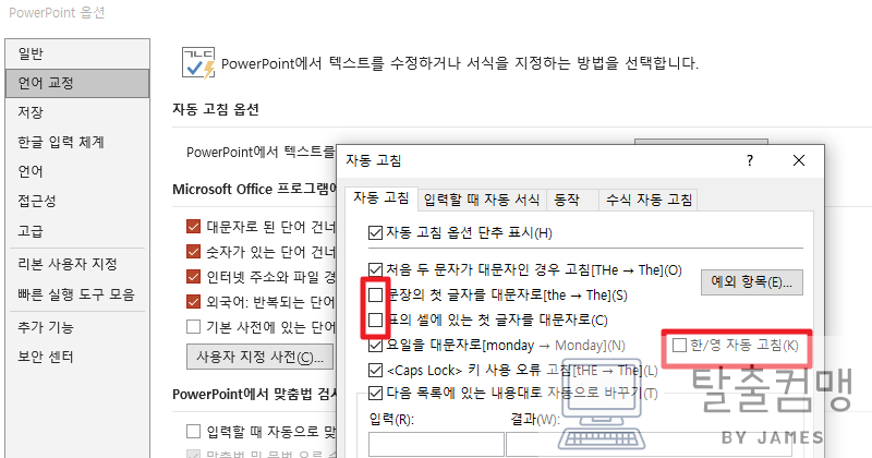 3개를 체크해제 해두시면 대문자와 한영자동고침에서 해방되십니다.