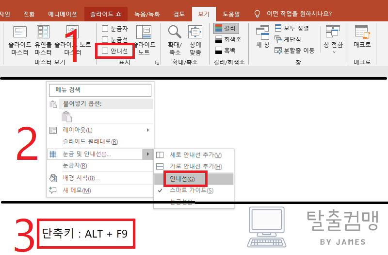 안내선을 켤 수 있는 방법은 3가지입니다.🔻