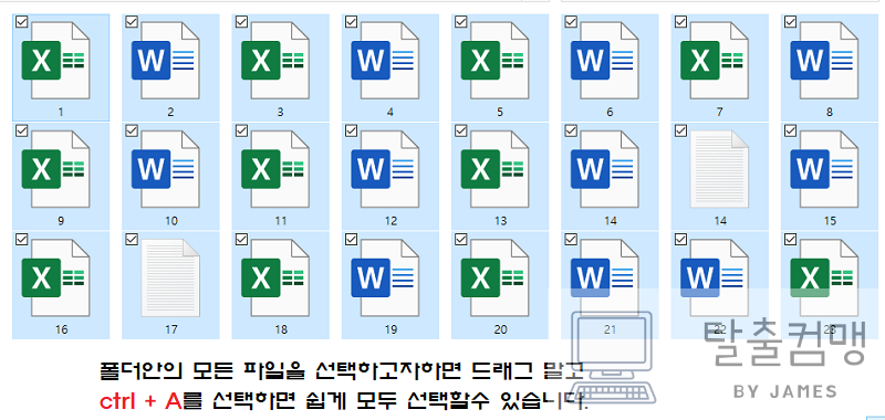 들어가기 앞서 혹시 모르셨다면 알아두시면 아주 편리합니다. 모르셨다면 오늘 꼭 손에 익히셔서 편리한 컴퓨터사용을 하시기 바랍니다. 하나 혹은 여러 파일을 동시에 선택할 때 마우스와 키보드를 함께 사용하면 더욱 효과적으로 파일, 폴더를 선택할 수 있습니다. 선택할 파일(폴더)이 하나 혹은 몇 개 되지 않으면 마우스 드래그로 선택하시면 됩니다. 그러나 파일수가 수십 수백 개이면 드래그로 하기 힘들뿐더러 또한 군데군데 필요한 파일을 선택하기에는 마우스드래그는 아주 힘듭니다. 이럴 때 키보드와 함께 (ctrl, shift) 파일을 효율적으로 선택해볼까요? 우선 알아야 할것은 모두 선택하기는 ctrl+A 입니다. ALL의 A로 기억하시면 쉽습니다. 1. 연속하는 파일(폴더)을 선택할 경우에는 마우스를 shift와..